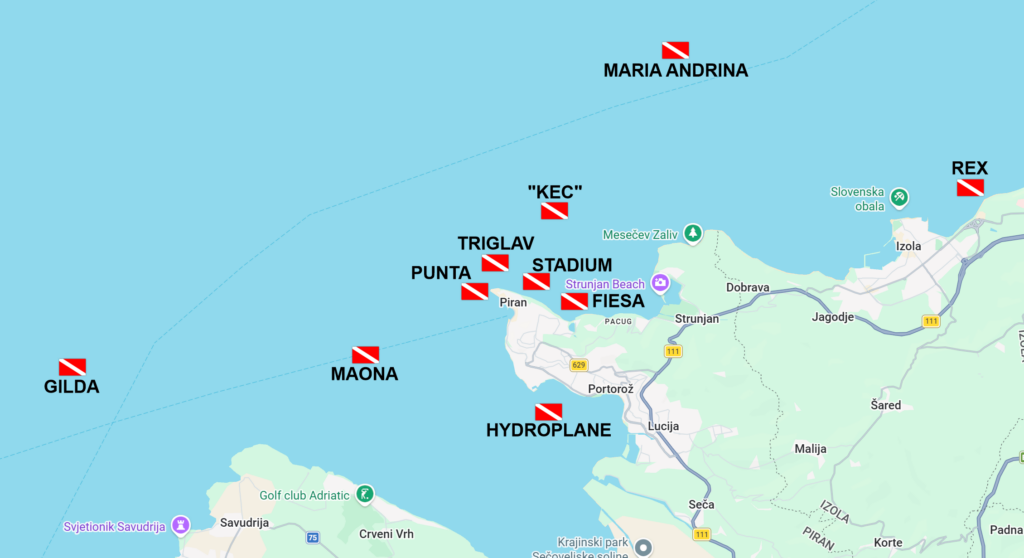 - Gilda wreck – steam boat sunk by mine in WW1. About 86m long. Excellent wreck, max depth 26m. Lots of various marine life, good visibility usually. Huge and impressive propeller. In disputed area between Slovenia and Croatia.